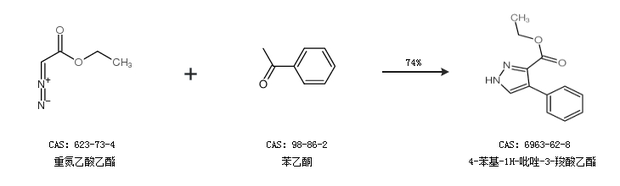 1.通过重氮乙酸乙酯和苯乙酮合成4-苯基-1H-吡唑-3-羧酸乙酯,收率约74%;