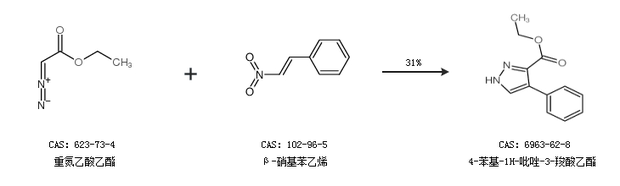 2.通过重氮乙酸乙酯和β-硝基苯乙烯合成4-苯基-1H-吡唑-3-羧酸乙酯,收率约31%;