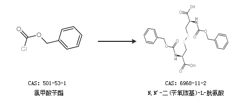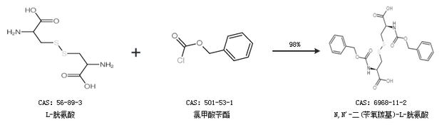 1.通过L-胱氨酸和氯甲酸苄酯合成N,N''-二(苄氧羰基)-L-胱氨酸,收率约98%;