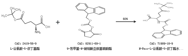 1.通过L-谷氨酸-5-叔丁基酯和9-芴甲基-N-琥珀酰亚胺基碳酸酯合成N-Fmoc-L-谷氨酸-5-叔丁酯水合物,收率约60%;