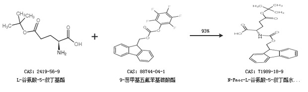 2.通过L-谷氨酸-5-叔丁基酯和9-芴甲基五氟苯基碳酸酯合成N-Fmoc-L-谷氨酸-5-叔丁酯水合物,收率约93%;