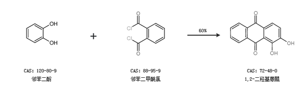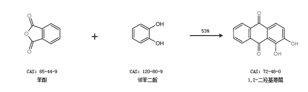 1.通过苯酐和邻苯二酚合成1,2-二羟基蒽醌,收率约53%;