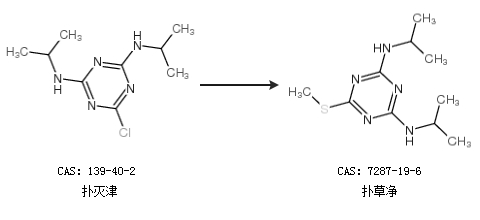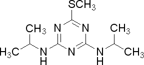 中文别名 割草佳;扑蔓尽;4,6-双异丙基-2-甲硫基均三嗪;4,6-双异丙胺基-2-甲硫基-1,3,5-三嗪;捕草净;扑灭通;2,4-双-(异丙基氨基)-6-甲硫基-1,3,5-三嗪;