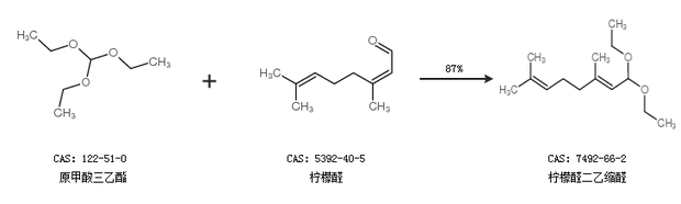 1.通过原甲酸三乙酯和柠檬醛合成柠檬醛二乙缩醛,收率约87%;