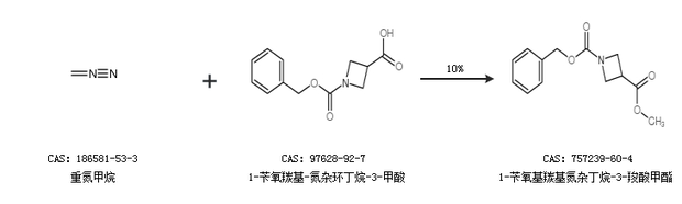 2.通过重氮甲烷和1-苄氧羰基-氮杂环丁烷-3-甲酸合成1-苄氧基羰基氮杂丁烷-3-羧酸甲酯,收率约10%;