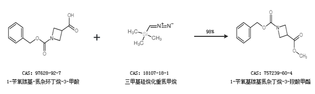 1.通过1-苄氧羰基-氮杂环丁烷-3-甲酸和三甲基硅烷化重氮甲烷合成1-苄氧基羰基氮杂丁烷-3-羧酸甲酯,收率约98%;