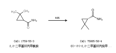 2.通过2,2-二甲基环丙甲酰胺合成(S)-(+)-2,2-二甲基环丙烷甲酰胺,收率约44%;