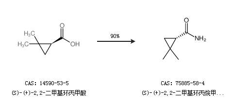 1.通过(S)-(+)-2,2-二甲基环丙甲酸合成(S)-(+)-2,2-二甲基环丙烷甲酰胺,收率约90%;