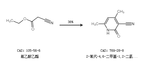 2.通过氰乙酸乙酯合成2-氧代-4,6-二甲基-1,2-二氢吡啶-3-甲腈,收率约38%;