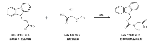 1.通过氯甲酸-9-芴基甲酯和盐酸肌氨酸合成芴甲氧羰酰基肌氨酸,收率约87%;