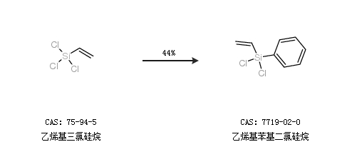 1.通过乙烯基三氯硅烷合成乙烯基苯基二氯硅烷,收率约44%;