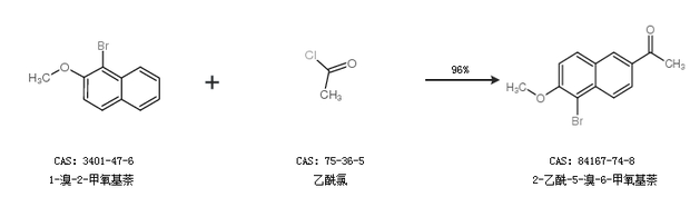 2.通过1-溴-2-甲氧基萘和乙酰氯合成2-乙酰-5-溴-6-甲氧基萘,收率约96%;