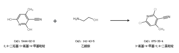 1.通过2,6-二羟基-3-氰基-4-甲基吡啶和乙醇胺合成3-氰基-4-甲基-2,6-二氯吡啶