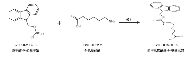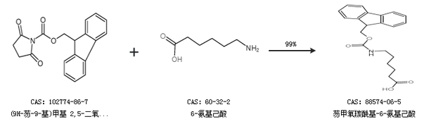 2.通过(9H-芴-9-基)甲基 2,5-二氧代吡咯烷-1-羧酸和6-氨基己酸合成芴甲氧羰酰基-6-氨基己酸,收率约99%;