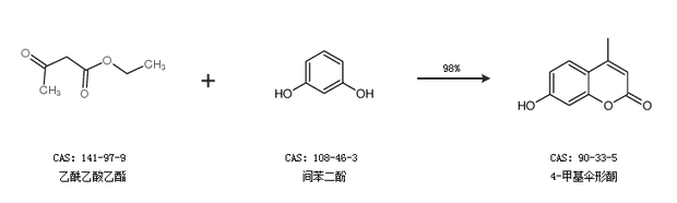 2.通过乙酰乙酸乙酯和间苯二酚合成4-甲基伞形酮,收率约98%;