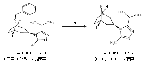 1.通过8-苄基-3-外型-(5-异丙基-3-甲基-4H-1,2,4-三唑-4-基)-8-氮杂双环[3.2.1]辛烷合成(1R,3s,5S)-3-(3-异丙基-5-甲基-4H-1,2,4-三唑-4-基)-8-氮杂双环[3.2.1]辛烷,收率约99%;