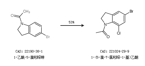 1.通过1-乙酰-5-溴吲哚啉合成1-(5-溴-7-氯吲哚-1-基)乙酮,收率约53%;