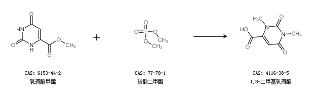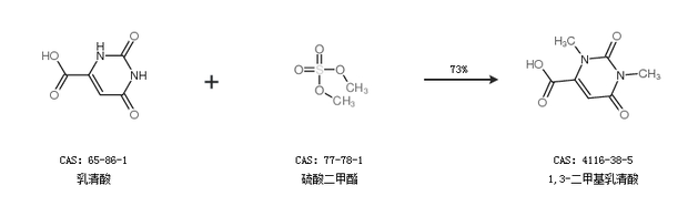 1.通过乳清酸和硫酸二甲酯合成1,3-二甲基乳清酸,收率约73%;