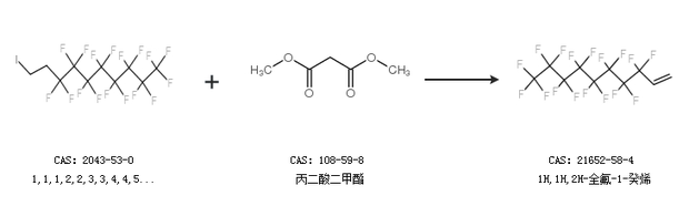 2.通过1,1,1,2,2,3,3,4,4,5,5,6,6,7,7,8,8-十七氟-10-碘庚烷和丙二酸二甲酯合成1H,1H,2H-全氟-1-癸烯