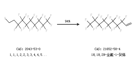 1.通过1,1,1,2,2,3,3,4,4,5,5,6,6,7,7,8,8-十七氟-10-碘庚烷合成1H,1H,2H-全氟-1-癸烯,收率约94%;