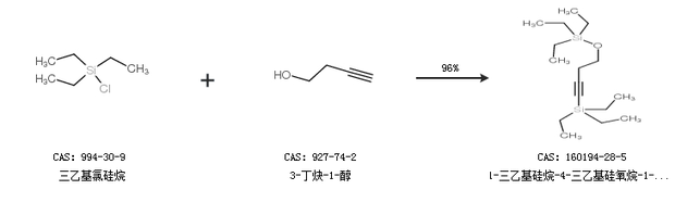 1.通过三乙基氯硅烷和3-丁炔-1-醇合成1-三乙基硅烷-4-三乙基硅氧烷-1-丁炔,收率约96%;