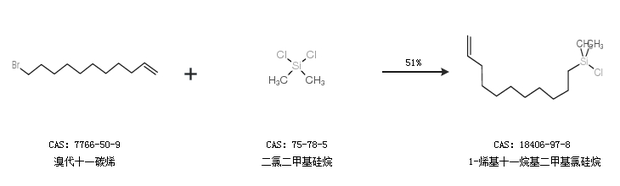 1.通过溴代十一碳烯和二氯二甲基硅烷合成1-烯基十一烷基二甲基氯硅烷,收率约51%;