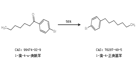 1.通过1-溴-4-n-庚酰苯合成1-溴-4-正庚基苯,收率约56%;