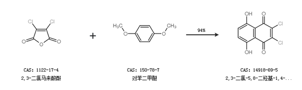 1.通过2,3-二氯马来酸酐和对苯二甲醚合成2,3-二氯-5,8-二羟基-1,4-萘醌,收率约94%;