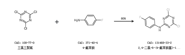 2.通过三氯三聚氰和4-氟苯胺合成2,4-二氯-6-(4-氟苯胺基)-1,3,5-三嗪,收率约80%;
