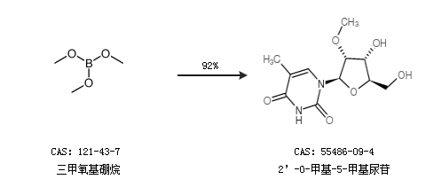 1.通过三甲氧基硼烷合成2’-O-甲基-5-甲基尿苷,收率约92%;