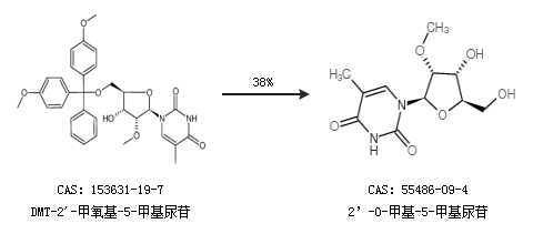 2.通过DMT-2''-甲氧基-5-甲基尿苷合成2’-O-甲基-5-甲基尿苷,收率约38%;