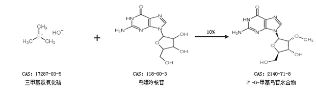 2.通过三甲基氢氧化硫和鸟嘌呤核苷合成2''-O-甲基鸟苷水合物,收率约10%;
