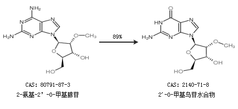 1.通过2-氨基-2’-O-甲基腺苷合成2''-O-甲基鸟苷水合物,收率约89%;