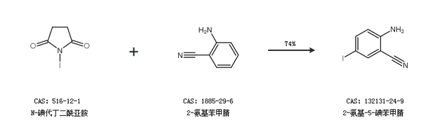2.通过N-碘代丁二酰亚胺和2-氨基苯甲腈合成2-氨基-5-碘苯甲腈,收率约74%;