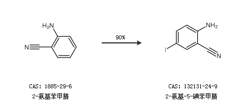 1.通过2-氨基苯甲腈合成2-氨基-5-碘苯甲腈,收率约90%;