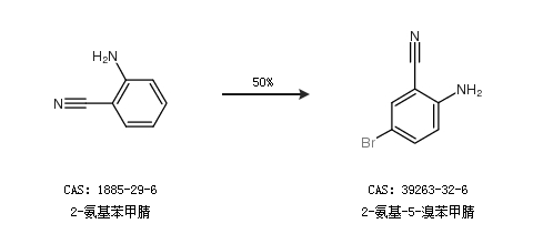 2.通过2-氨基苯甲腈合成2-氨基-5-溴苯甲腈,收率约50%;