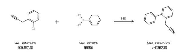 1.通过邻氯苯乙腈和苯硼酸合成2-联苯乙腈,收率约89%;