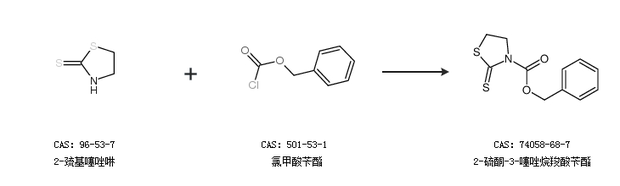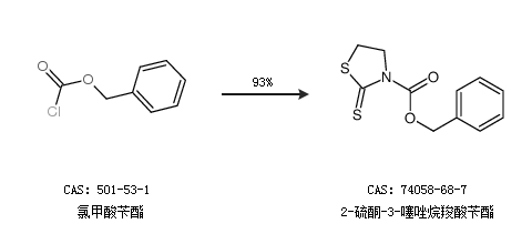 1.通过氯甲酸苄酯合成2-硫酮-3-噻唑烷羧酸苄酯,收率约93%;