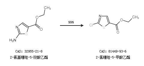 2.通过2-氨基噻唑-5-羧酸乙酯合成2-氯噻唑-5-甲酸乙酯,收率约99%;