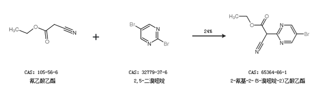 1.通过氰乙酸乙酯和2,5-二溴嘧啶合成2-氰基-2-(5-溴嘧啶-2)乙酸乙酯,收率约24%;