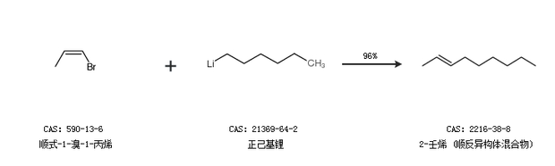 1.通过顺式-1-溴-1-丙烯和正己基锂合成2-壬烯 (顺反异构体混合物),收率约96%;
