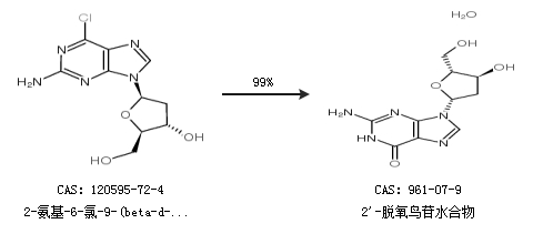 2.通过2-氨基-6-氯-9-(beta-d-2-脱氧核糖)嘌呤合成2''-脱氧鸟苷水合物,收率约99%;