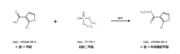 1.通过2-溴-3-甲酸和硫酸二甲酯合成2-溴-3-呋喃糠酸甲酯,收率约92%;