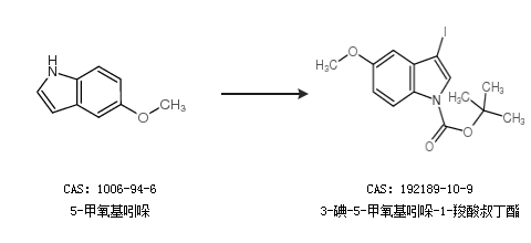 1.通过5-甲氧基吲哚合成3-碘-5-甲氧基吲哚-1-羧酸叔丁酯
