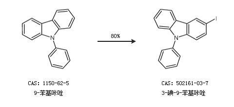 2.通过9-苯基咔唑合成3-碘-9-苯基咔唑,收率约80%;