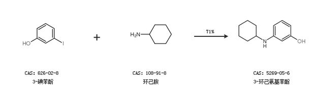 2.通过3-碘苯酚和环己胺合成3-环己氨基苯酚,收率约71%;