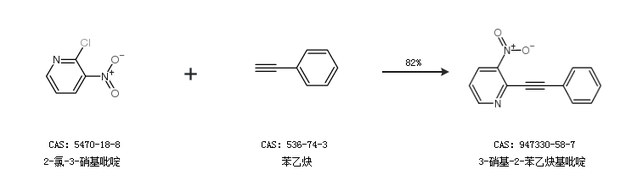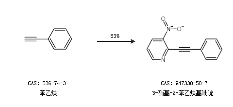 2.通过苯乙炔合成3-硝基-2-苯乙炔基吡啶,收率约83%;