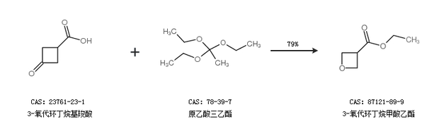 2.通过3-氧代环丁烷基羧酸和原乙酸三乙酯合成3-氧代环丁烷甲酸乙酯,收率约79%;