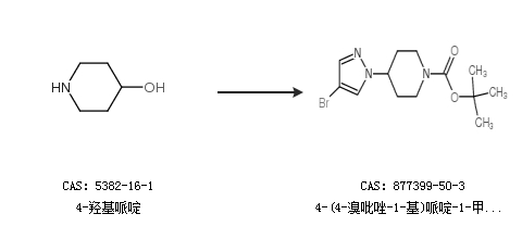 2.通过4-羟基哌啶合成4-(4-溴吡唑-1-基)哌啶-1-甲酸叔丁酯
