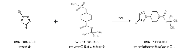 1.通过4-溴吡唑和1-Boc-4-甲烷磺酰氧基哌啶合成4-(4-溴吡唑-1-基)哌啶-1-甲酸叔丁酯,收率约72%;